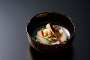 今回の試作ではそんな泉州若布を使っての真薯。よく洗っておいた若芽の色だしをしミキサーでペーストに。これを擂り鉢で白身魚のすり身と共にあたり、そこへつくね芋と吉野葛、卵白を加えて流し函に。これを80℃程度の温度帯で蒸し上げる。吸い地の出汁は蛤。蛤を酒と昆布出汁で火入れした後に、貝身は取り出しておく。これに加えて塩蔵広布(ひろめ)を細切りし出汁に浸ける。蛤出汁を加減し若布真薯と刻んだ蕗の薹と共に先ほどの広布を盛りつける。