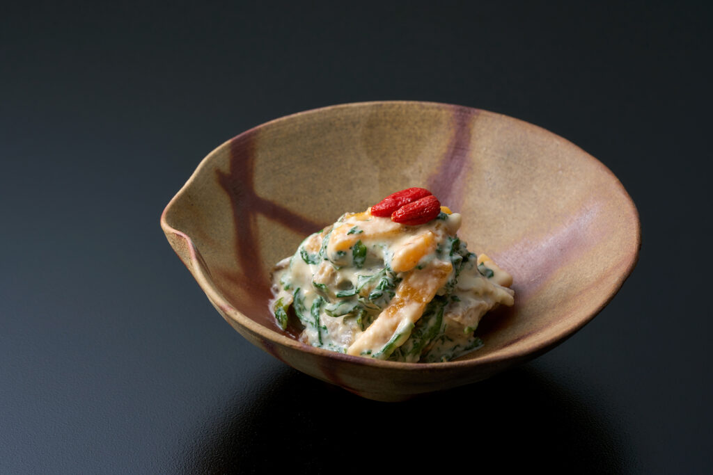 先ずは牛乳をゆっくり混ぜながら煮詰めていく。これがヘラですくえるほどに煮詰まれば冷蔵庫にて一夜冷やす。これを繰り返し、程よい固さになったところを裏漉しにかける。ここではこれを白和え衣に見立て、干した舞茸に下味をつけた大徳寺麩そして菊菜を合わせ和え、最後にアクセントとして柿を加えている。酥には何も加えないことで、和える各食材の味を引き立てる。シンプルながら味わい深い大阪料理といえよう。