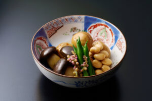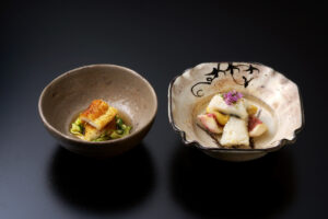 日本では家畜としての牛を食べることに対して禁令が布かれていたことから、 料理においては牛 (うし) とは呼ばず 「ぎゅう」 と音読した。 よって牛肉は 「ぎゅうにく」 であり、 その調理法は醤油や味醂そして砂糖を多用することで和食としての独自の牛肉食文化を育んできたといえよう。 今回の試作では数ある部位の中でも舌部を活用することで、より日本料理的な食材としての意味合いを高めている。さらに日本料理において尊重される生に近い仕上がりを目指し、 60度で30分という低温調理法を用いている。 漬地には赤味噌などを煮切味醂でのばしたものを調味しこれに約二昼夜の間漬け込んでいる。 味噌の柔らかな塩味の中にほのかな甘みと辛味も感じられるところが、 何とも大阪仕立てと呼ぶに相応しいのではなかろうか。 何気ない、 あしらいの泉州玉葱の甘酢漬けにもまた大阪郷土料理らしさがあり見事。