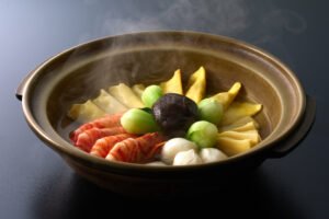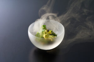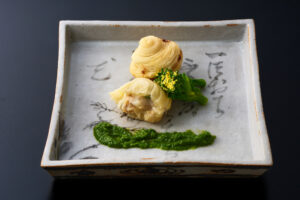 渡り蟹を蒸してほぐし身とし、殻は焼いて鰹昆布と合わせ蟹出汁を引く。この蟹出汁に、発酵させた大阪しろ菜を入れ、平湯葉と蟹のほぐし身を加え、大阪しろ菜の発酵汁で酸味を調整した後に葛を引き餡としている。大阪しろ菜に限らず、いわゆる昔の野菜と呼ばれる品種には、天王寺蕪なども含め乳酸発酵しやすい野菜が多く存在する。こうした野菜が持つ発酵の酸味は漬物を除いては日本料理に使われることがなかった。しかし中国料理に見るように、野菜の発酵力を料理に活かす時代がすでに来ているのではなかろうか。
